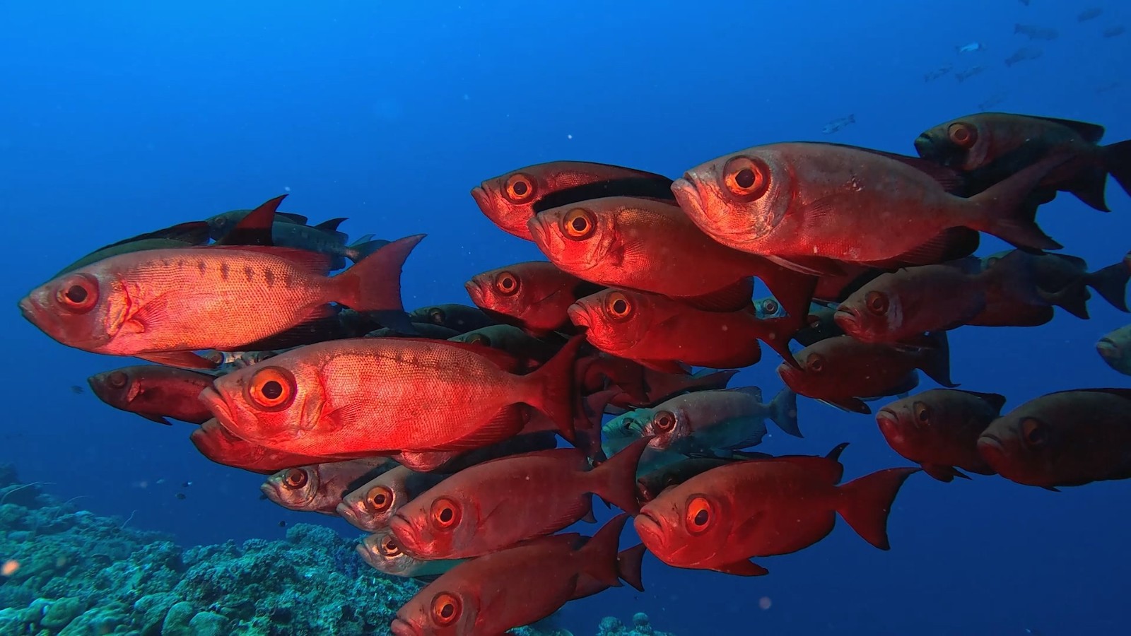 一群金目大眼鲷在珊瑚礁边缘活动